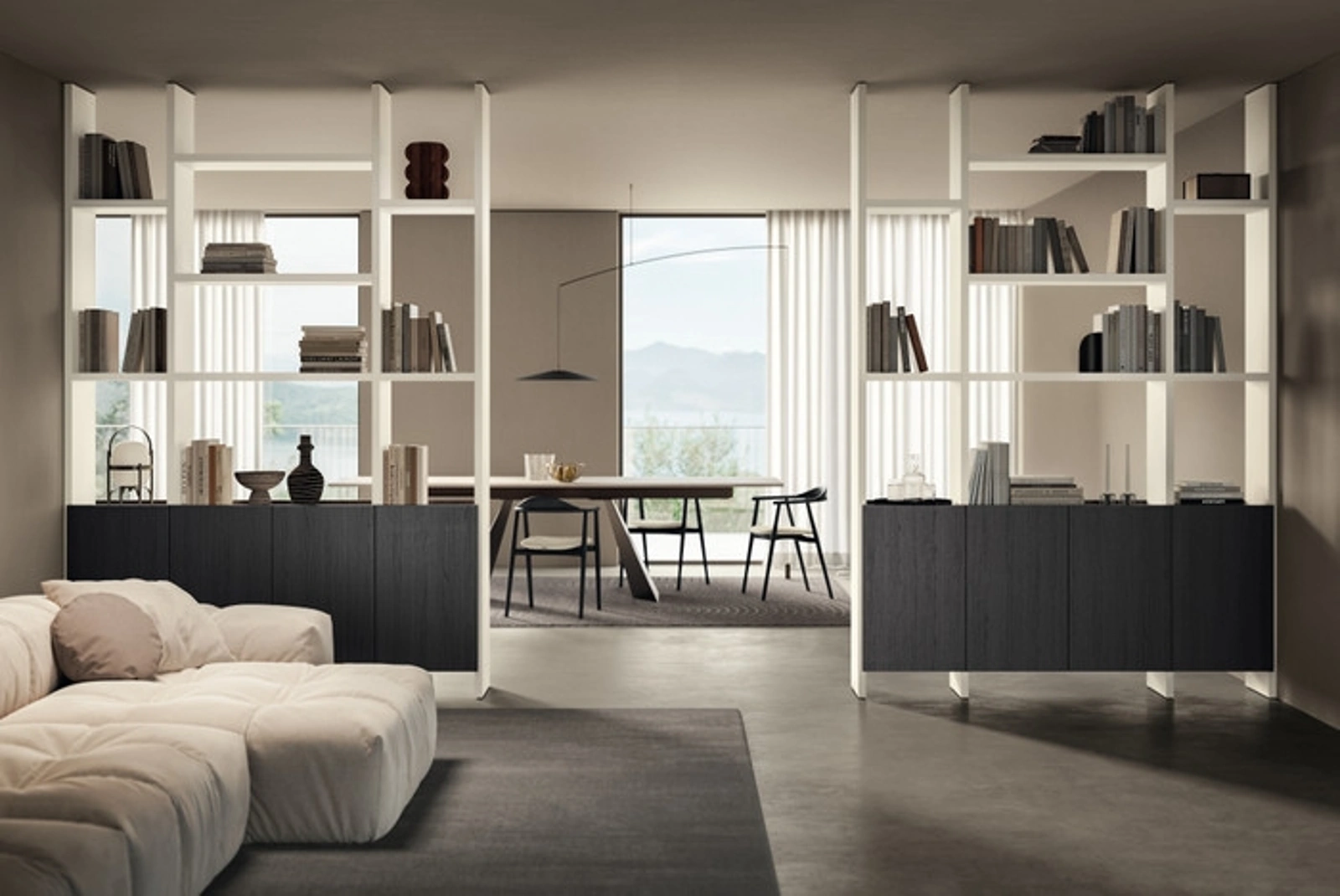 Texture di pregio e linee decise: scopri la libreria Living Essenza Fluida di Scavolini tra le più belle Librerie moderne divisorie.